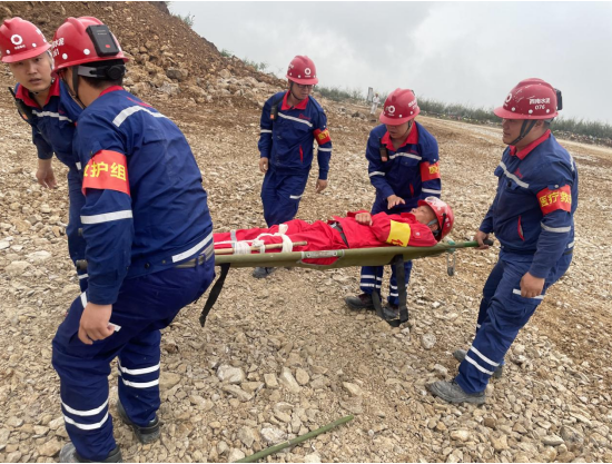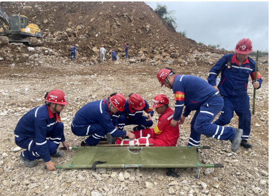 演練現場模擬遇強降雨后邊坡發生垮塌事故,在接到險情報告后,應急指揮部立即啟動應急預案,組織各救援小組趕赴現場