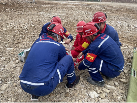 受傷人員救出后,醫療救護組進入現場,通過傷情檢查,發現傷員腿部受傷,立即對傷員進行救治